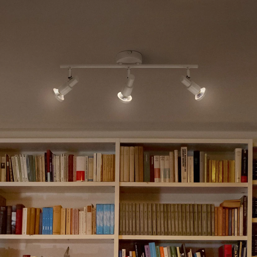 3-bulb GU10 ceiling spotlight with dimmable LED reflectors The LED downlight Spot is made of steel with a matt surface finish and comes with three dimmable GU10 LED bulbs from OSRAM with a warm white light colour. The spots can be rotated and swivelled as desired thanks to the built-in ball joints. The mounting and connection accessories are included. Product benefits of the Spot luminaire series: - Timeless design and durability thanks to replaceable bulbs - Adjustable heads - High-quality housing with matt finish - Versatile customisation thanks to replaceable LED bulbs