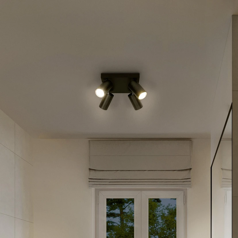 Octagon LED downlight, 4-bulb, square, dimmable Octagon is a square-shaped LED downlight with four rotatable and swivelling spotlights. It is made of steel with a matt finish and comes with a dimmable GU10 LED bulb. The four spots can be rotated and swivelled to direct the lighting into different areas of the room. The LED spotlights in the Octagon series are characterised by their timeless design, high-quality steel housing with a matt finish, versatility of use and durability thanks to replaceable bulbs - dimmable OSRAM LED bulbs included - easy installation - complete installation and connection accessories included.