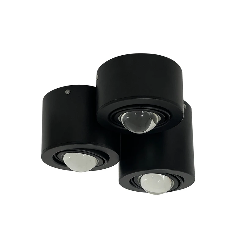 3-bulb downlight Jyla made of iron with cylindrical lampshades This downlight is simple and modern. It is made of iron and has a black surface. The three lampshades are different sizes and cylindrical in shape. The GX53 bulbs supplied have a curved lens and therefore look like glass hemispheres. Jyla's heads can be swivelled by 15°, so the light beam can be directed as required, and a wall switch allows the downlight to be switched on and off as usual. Thanks to the 3-step dimmable technology with integrated off function, it can also be dimmed to three different brightness levels by pressing the switch several times: 100 %, 50 % and 25 %.