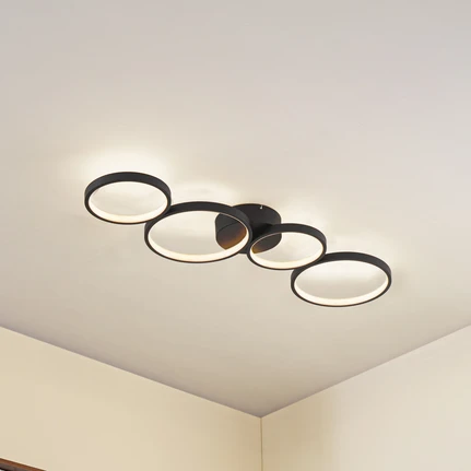 The Evengeline LED ceiling lamp impresses with its fresh and varied appearance. Its body is made of aluminium and painted black. Four light circles are mounted horizontally offset on its ceiling canopy, creating an interesting shape. Permanently installed LEDs are mounted inside the circles and, thanks to their round shape, create an interesting light that reflects circular patterns onto the ceiling. The Evengeline LED ceiling light combines reliable lighting with an exciting design. Its warm white LEDs create the right light for living rooms or bedrooms, while its exciting shape adds playful accents to ceilings. Thanks to its subtle colour scheme and slim body, it can be easily integrated into modern interior styles.