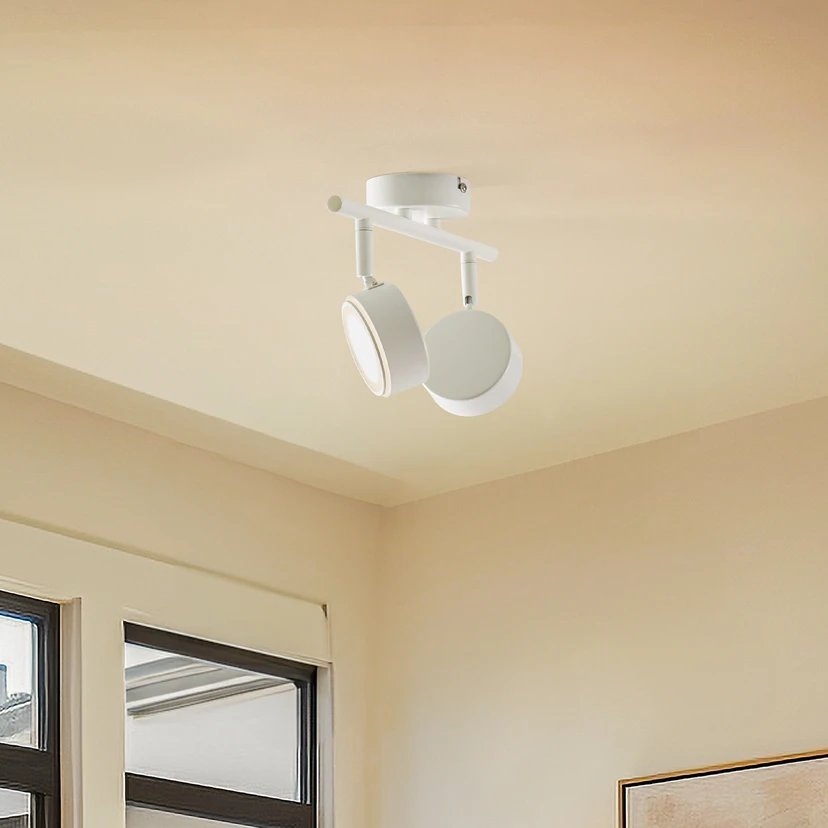 White Jyla spotlight with swivelling lampshades, dimmable The 2-bulb Jyla downlight is made of iron and its white exterior gives the surroundings an elegant touch. At the same time, it blends effortlessly into different living areas thanks to its discreet design. For example, it is ideal for use as a light source in the hallway, kitchen, living room or dining room. The round lampshades are adjustable, allowing the light to be individually directed and the room to be optimally illuminated. Two GX53 bulbs are included and the light can be switched on and off as usual using a wall switch. Thanks to the 3-step dimmable technology with integrated off function, it can also be dimmed to three different brightness levels by pressing the switch several times: 100 %, 50 % and 12 %.