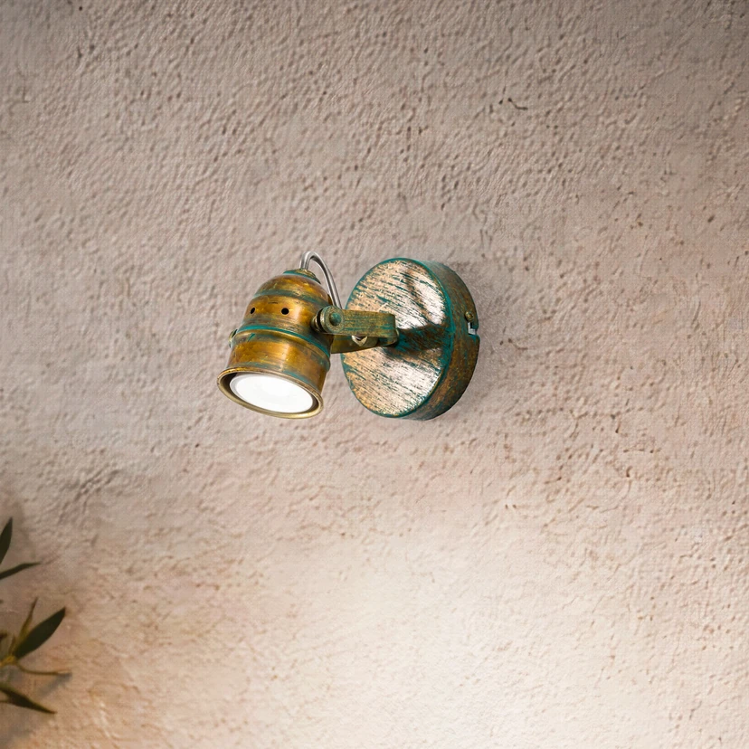 1-bulb spot Leonor for GU10 lamps and verdigris finish Leonor has a movable lampshade and can therefore be wall-mounted or ceiling-mounted. The spot has a very antique look, as the entire surface looks as if many years have passed since the light was manufactured and the signs of time have now immortalised themselves on the metal. The classic verdigris look, which symbolises the ageing process of metal, can be seen everywhere.