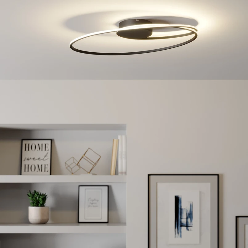 Xenias LED ceiling light in trendy matt black colour, dimmable Xenias LED ceiling light impresses thanks to its elegant and futuristic design. The intertwined ovals give the light individuality and make it an artistic element in the modern home. The matt black colour is on trend and gives the light a special finish. Xenias brings dynamism into the room and provides wonderful moments of light at the same time. It emits a warm white light that can be dimmed as desired using a wall switch. You can choose between three brightness levels (100%, 50% and 10%).