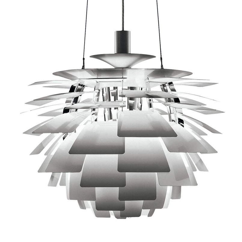 Artichoke hanging light: a skilfully crafted designer object When you see the Artichoke hanging light, the plant of the same name from the composite family, whose edible inflorescences are often eaten as vegetables, involuntarily comes to mind. Das is due to the 72 leaf-like metal elements that make up the body of the Artichoke hanging light, which is still largely handcrafted today in order to maintain the high quality standards. The precisely angled leaves are distributed over twelve individual rows of six leaves each and create a very homogeneous and completely glare-free light emission, just as its creator, the designer Poul Henningsen, had set himself the goal for his luminaire creations.