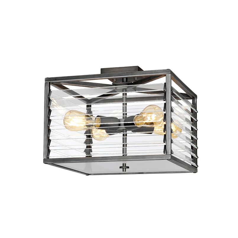 Four-light Louvre ceiling lamp with an industrial touch The four-light Louvre ceiling lamp is a real eye-catcher in an industrial style of living. Its square shade is made of gunmetal metal in silver and brushed black, the four E27 sockets each point to one side so that the ambient lighting is comprehensive. The sides of the shade frame are fitted with clear glass lamellae, which on the one hand reinforces the industrial impression and on the other hand gives the look a certain lightness. The most beautiful overall impression is achieved by using filament or rustic lamps, as available via the accessories. - externally dimmable