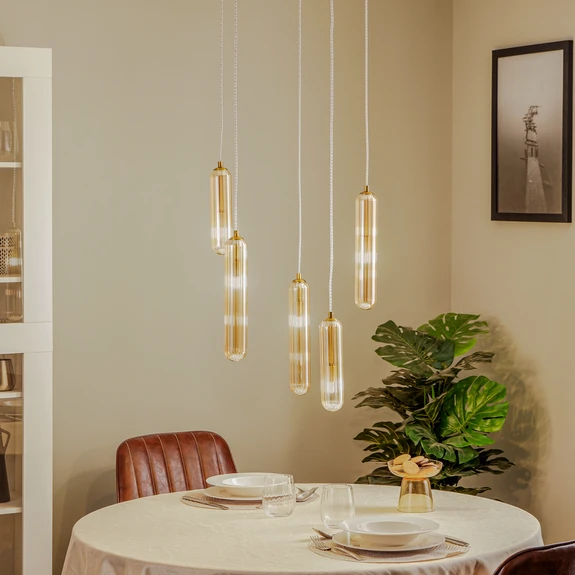 Freylin pendant light made of glass with five lampshades This light creates cosiness and pleasant lighting conditions in your home. The hanging light combines all the qualities and special features of the Lucande brand. You can adjust the brightness to suit your mood using an external dimmer (not included). Freylin has a beautiful design and blends beautifully into any room. The amber and brass-coloured pendant light will add a personal touch to your living space, wherever it is installed. It is suitable for bulbs with a G9 base. Thanks to the lamp's pleasant light, any room will be perfectly accentuated. Create attractive lighting within your four walls with this interior lamp.