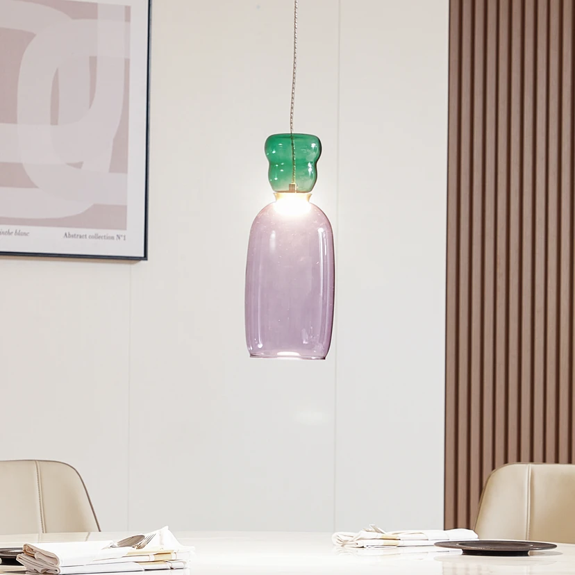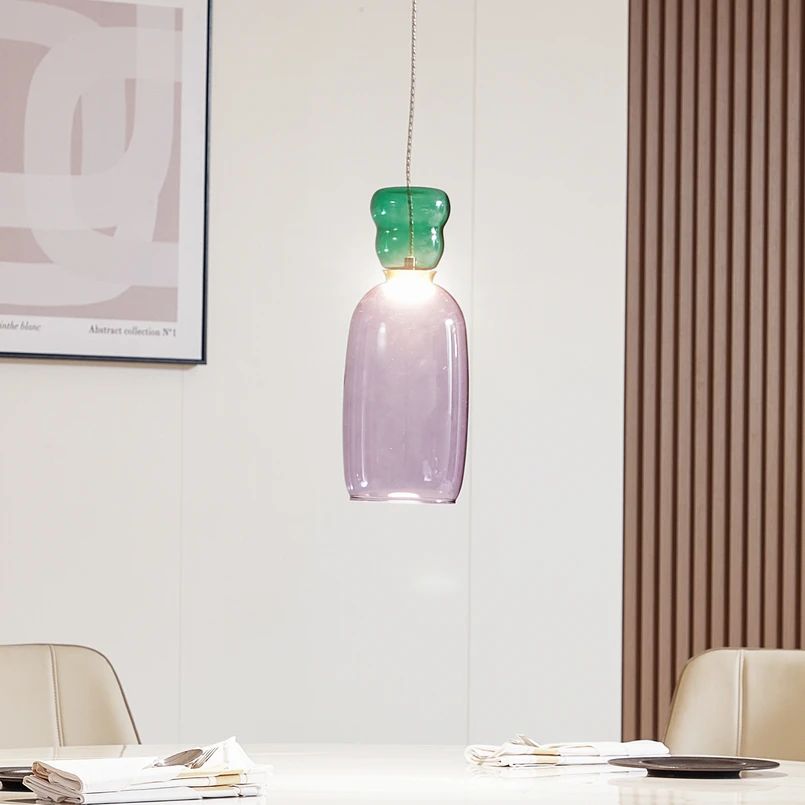 LED pendant light Fay with glass shade in purple Thanks to its special colour design in purple and dark green, the LED pendant light Fay is a beautiful eye-catcher in the living area both when switched on and off. The warm light is directed towards the floor and emitted glare-free into the surroundings through the glass shade. Fay can be used wonderfully as a light source in the kitchen, dining room or living room, for example. The rounded lampshade is complemented by a dark green glass element that perfectly rounds off the decorative look.