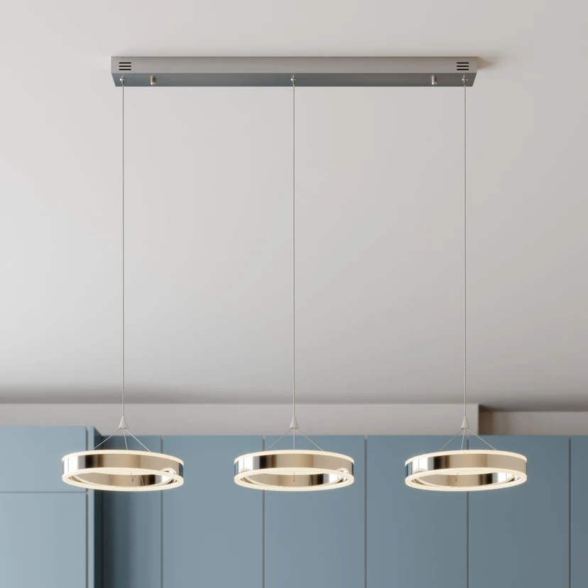 Ideal for dining table lighting: the 3-bulb Lyani hanging light with switch-dimmable LEDs Three rings made of chrome-plated metal are the main components of the Lyani LED hanging light. Together they provide bright light, but you also have the option of adjusting the brightness in three stages to make the light appear cosier. This function is controlled via the normal wall switch. With its chrome design and ring-shaped lampshades, the LED pendant light radiates a particularly modern look.