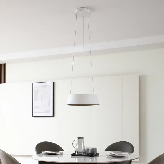 The Belsar LED pendant light: CCT function for atmospheric lighting The Belsar LED pendant light can redefine the atmosphere in living and dining rooms with its CCT function. This elegant lighting solution combines an attractive design in white and gold with the flexibility to adjust the light colour as required. This is made possible by a dip switch within its canopy, which can be used before installation and can change the light colour between warm white and cool white. The integrated LED light source provides energy-efficient illumination, while the modern style enhances the ambience of any room. Although a dimmer is not included, the brightness can be adjusted using an external dimmer (trailing edge or trailing edge phase dimmer) to create the desired mood.