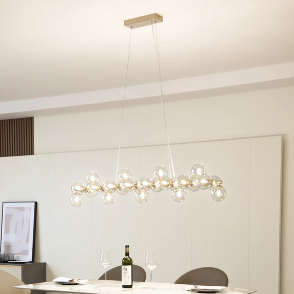 Naelen pendant light in gold and amber-coloured optics This beautifully shaped light combines functional lighting with an attractive design. The light can be dimmed to your liking using an external dimmer (not included). Opt for first-class brand quality from Lucande with this hanging light. Naelen effectively complements the lighting concept of any living space with its stylish design. The hanging light in the colour gold integrates perfectly into your room and creates a great ambience. It has G9 sockets. Your interior will be enriched by this pendant light. Give your home an even more attractive ambience with this lamp.