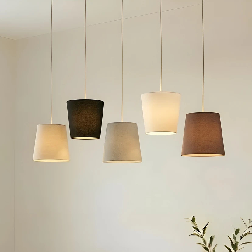 Five-light pendant lamp Thamila with decorative fabric shades in different colorsThamila is an ideal lighting solution for a dining table in the living room or a similar place such as a counter. The pendant lamp performs valuable services there, providing beautiful lighting that is warm and cozy. Each shade is made of fabric and has a different color, thus the lamp is not colorful, but has an earthy expression, because natural tones dominate the design and the colors gray, black, white and brown, as well as a caramel cream tone can be found. Comfortable lighting for modern living areas!
