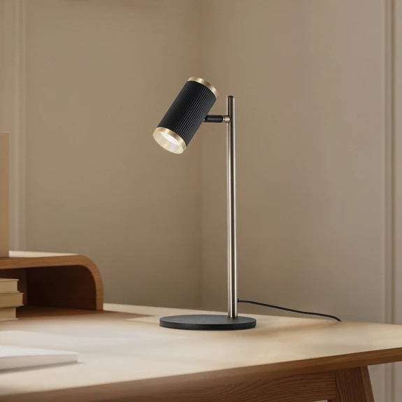 Lumens table lamp in black and antique gold with adjustable spot Functionally convincing and designed in a trendy colour combination of black and antique gold, the Lumens table lamp enriches living rooms and lounges. The round base supports a vertical frame rod. A spot is attached to the side of the latter, which can be aimed at the desired area.