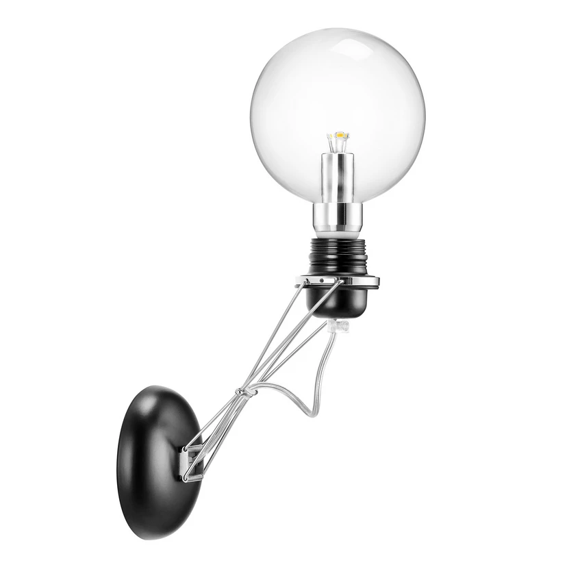 Matrix Mono is a wall lamp designed by Yaacov Kaufman. The idea came to him during his research on the friction mechanism. A round wall element and flexible, adjustable steel arms and an E27 socket at their end - these are the components of the wall lamp, which catches the eye by its simplicity. Depending on the choice of the illuminant, the luminaire can be changed in its appearance. The arm of the lamp is movable.
