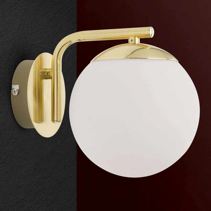 The Madis wall light has a classic metal frame with a matt brass finish and an opal white glass lampshade in a spherical shape. This timeless light source is suitable for installation in the hallway or in the living area or a bedroom. It can be fitted with an E14 bulb with a wattage of up to 40 watts and is also perfect for combining with other lamps from the series.