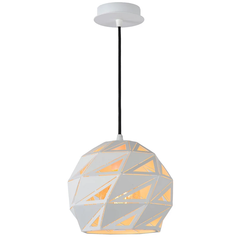 The white Malunga pendant lamp is a trendy light object above any table. The white metal shade with a golden inside has been worked with a unique punched pattern, which allows a view of the golden inside surface. Comfortable lighting is created by the reflections of the golden inner surface and the punched pattern creates beautiful light and shadow effects in the room.