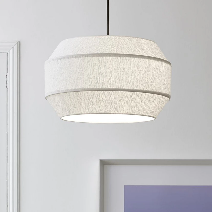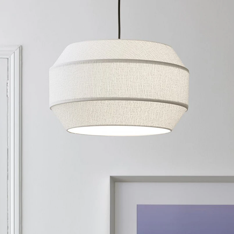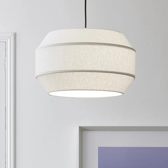 The Cosiness pendant light perfectly enhances a cosy, comfortable atmosphere. The lampshade is made of white fabric with a loop stitch pattern. A metal canopy and a black textile cable complete the Cosiness pendant light.