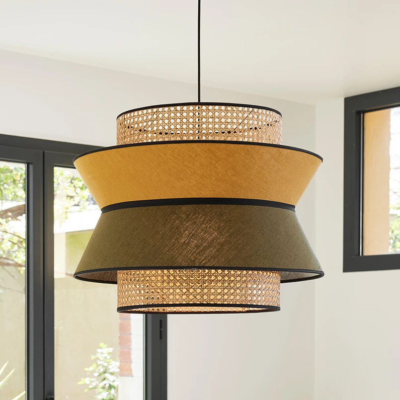 Singapour XL pendant light with two-layer shade made of textile and Viennese wickerwork The Singapour pendant light impresses with its naturalness and cosy appearance in both private and public/commercial interiors. The light source from French design label MARKET SET has a slightly Asian feel and is characterised by the look of the shade. This is made up of an inner layer of rattan processed into a Viennese weave and an outer layer of textile. The latter is divided into two sections of linen textile in contrasting colours. Black edges serve as a modern stylistic device to emphasise the individual elements. A black suspension with textile cable and metal canopy completes the pendant light.