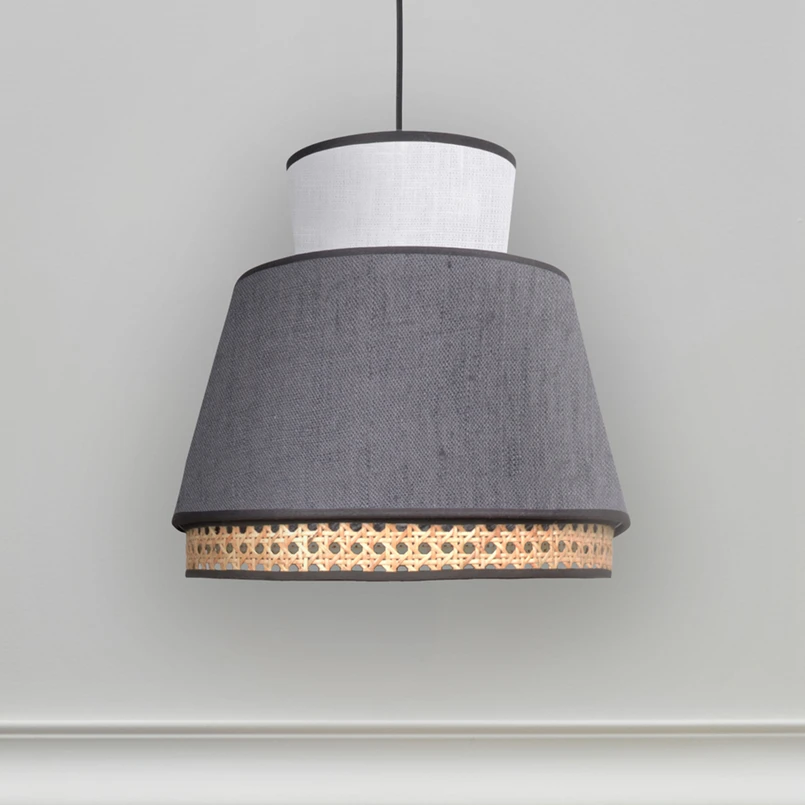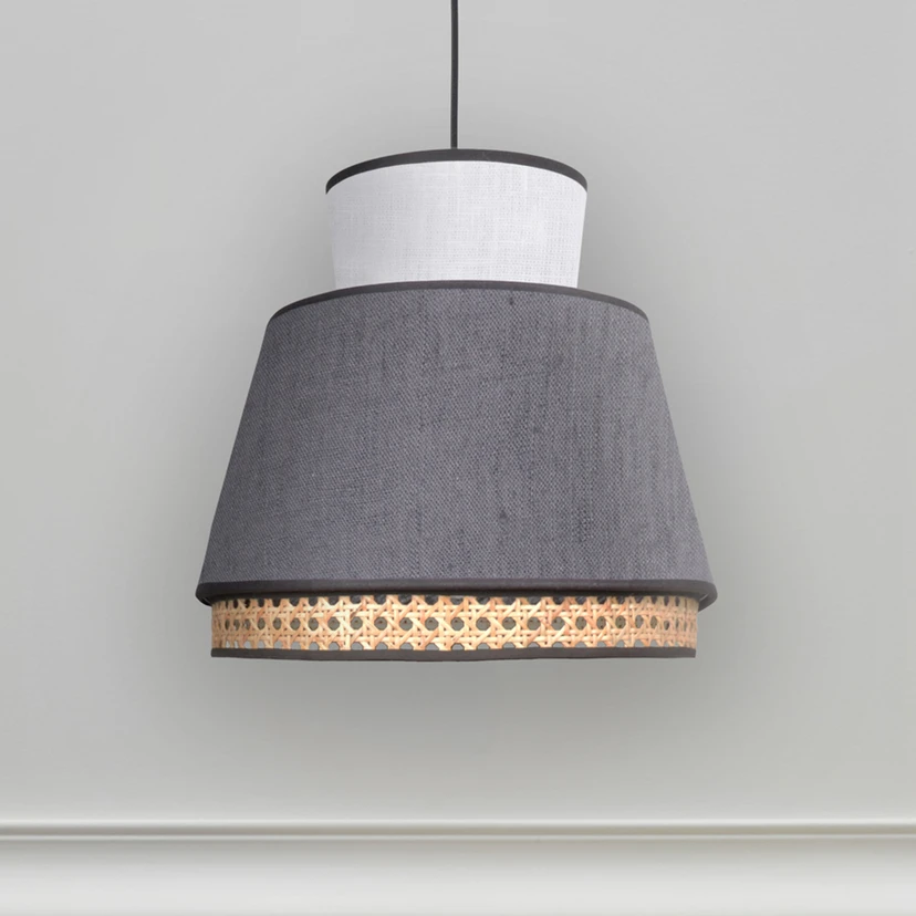 Hanging lamp Singapour with shades from natural fabrics The hanging lamp Singapour has three shades: The lower edge is formed by a shade from natural rattan weave. Two shades of washed linen fabric are draped over it, with the smaller shade forming the upper end. As soon as the lighting is switched on, the diversity of materials and colours is shown to its best advantage and the rattan weave is slightly visible under the linen fabric. A great pendant lamp for general or area lighting, which can also be adjusted in brightness via an external dimmer. The design comes from MARKET SET: under this label, the manufacturing company Corep SAS releases a new collection of products by young designers every year. - equipped with textile cable