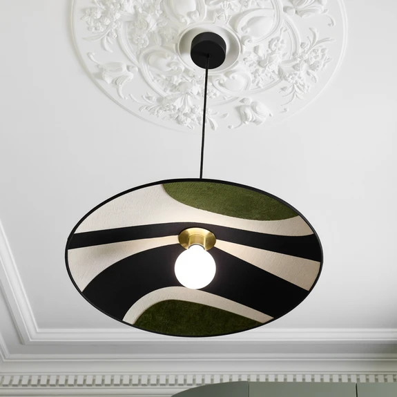 Sonia Laudet pendant light with large, patterned textile shade With its opulent fabric shade, the single-flame Sonia Laudet pendant light is an effective eye-catcher in almost any setting. The dynamic colour gradient of the textile lends the pendant lamp a lively and unique character. The sandblasted metal socket is located in the centre and can be ideally fitted with a decorative light source whose light shines downwards at a wide angle without obstruction. The textile-coated cable and the metal canopy are finished in black. The aesthetic design comes from the MARKET SET lighting label in collaboration with the French designer Sonia Laudet. The name of the light series was also dedicated to her.