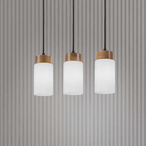 The Markus pendant light combines Scandinavian design with the natural beauty of glass and wood. This light is not only an eye-catcher in any room, but also an example of high-quality European craftsmanship. The three cylindrical lampshades made of opal glass and open at the bottom provide soft lighting on all sides and direct table lighting, for example. A natural oak cap connects each of them at the top. In addition, there is a cable and a long canopy in black.
