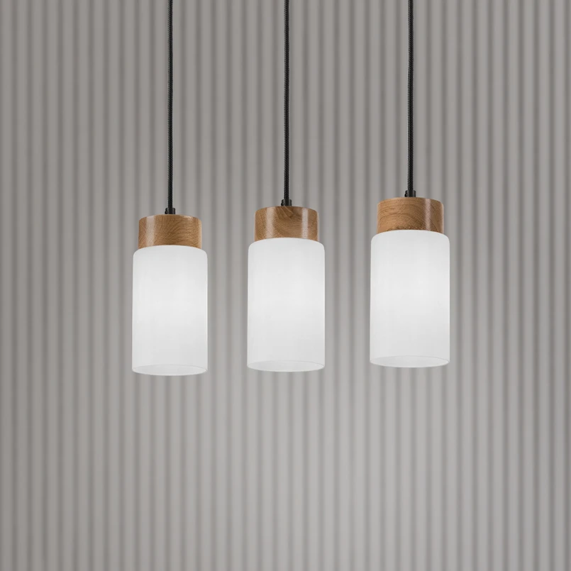 The Markus 3-bulb pendant light with cylindrical glass lampshades and oak details.