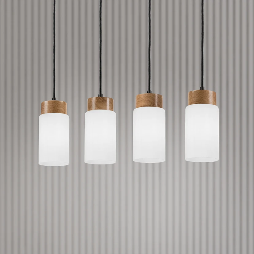 The Markus pendant light combines Scandinavian design with the natural beauty of glass and wood. This light is not only an eye-catcher in any room, but also an example of high-quality European craftsmanship. The four cylindrical, open-bottomed lampshades made of opal glass provide soft lighting on all sides and direct table lighting, for example. Above each of them is a cap made of natural oak. In addition, there is a cable and a long canopy in black.
