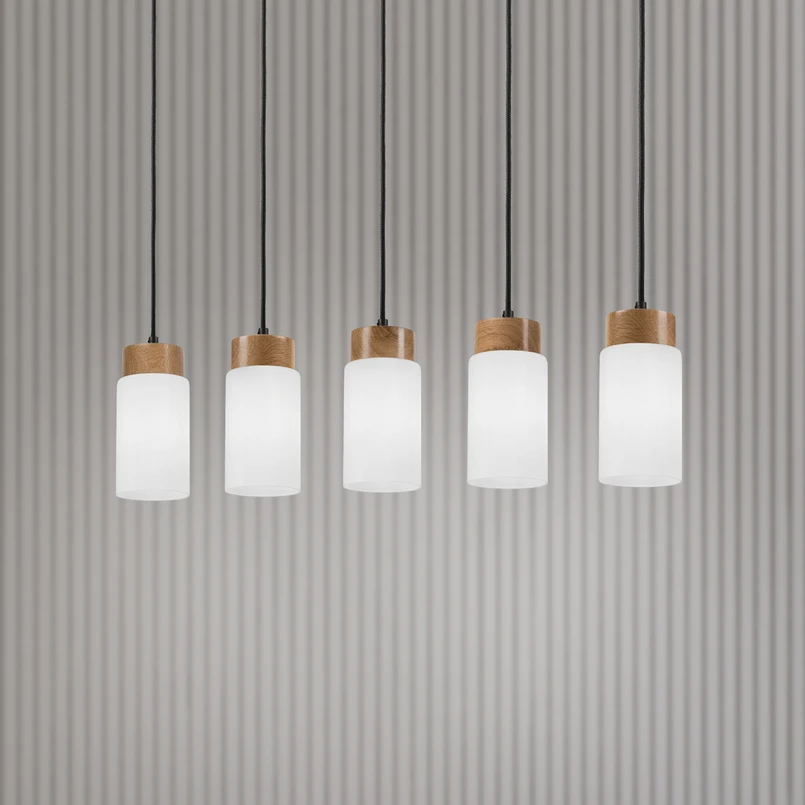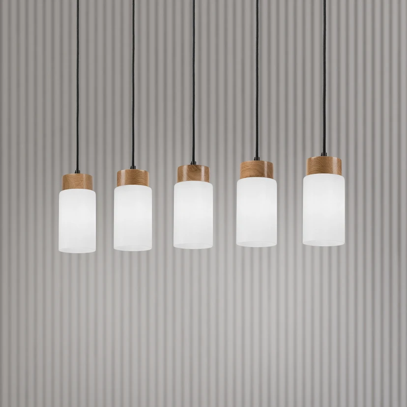 The Markus 5-bulb pendant light with cylindrical glass lampshades and oak details