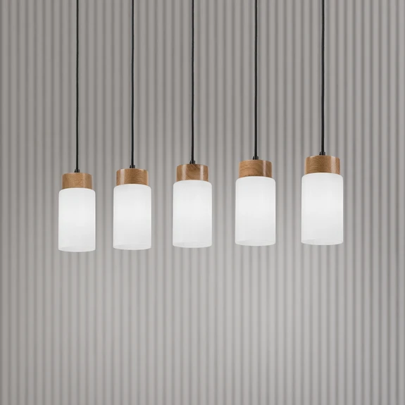 The Markus pendant light combines Scandinavian design with the natural beauty of glass and wood. This light is not only an eye-catcher in any room, but also an example of high-quality European craftsmanship. The five cylindrical, open-bottomed lampshades made of opal glass provide soft lighting on all sides and direct table lighting, for example. Above each one is a cap made of natural oak. In addition, there is a cable and a long canopy in black.