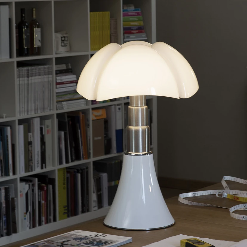 Pipistrello LED table lamp - timeless design and modern functionality This multi-award-winning light source is an elegant accessory for the table and floor in any setting. The Pipistrello series dates back to 1965, when it was created by the Italian designer and architect Gaetana "Gae" Aulenti (1927 - 2012) for the manufacturer Martinelli Luce, which still produces the table lamp today. The structure consists of a concave base made of stainless steel and a lampshade made of opal methacrylate divided into four sections. The latter is supported by a telescopic device that allows the overall height to be adjusted from 66 to 86 cm. The light from the integrated LEDs is not only particularly pleasant thanks to the opal lampshade, but can also be adjusted in brightness and colour temperature as required (Tunable White/CCT). Thanks to the integrated Casambi Bluetooth module, this can be done via the free Casambi App (available for iOS and Android) on a Tablet or smartphone.
