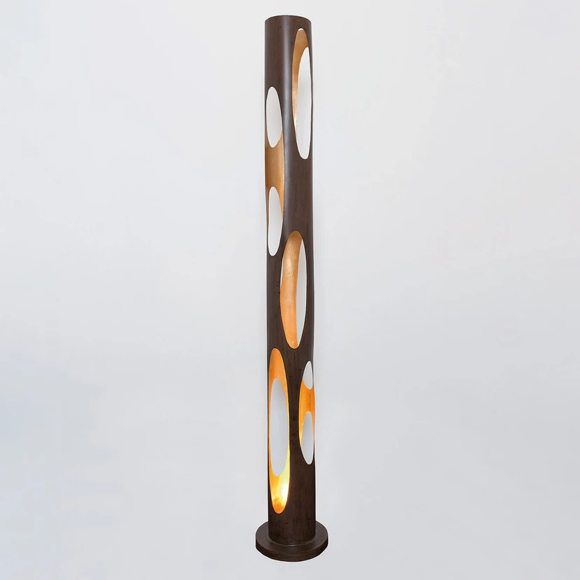 The lamp is made of iron, is cylindrical and has elliptical recesses in various sizes. The base is black and round. The outside is also black. Inside, a golden-brown colour gradient from bottom to top provides warm light rays. Thus the floor lamp inspires with a lighting concept for a cosy ambience.