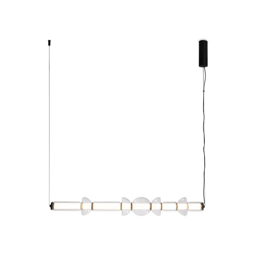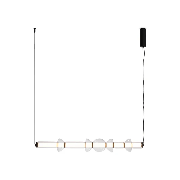Can be mounted horizontally or vertically: Cosmo LED pendant light made of glass The Cosmo LED pendant light lives up to its name. It has a futuristic style with a metal frame and a round glass lampshade with ornaments in the form of thin strips. The design solutions of the Cosmo luminaire series refer to the silhouettes of spaceships and aircraft from science fiction. The long glass lampshade with an integrated LED light source inside is suitable both as main lighting and for decorative compositions to illuminate interiors and dispel the cosmic darkness. The integrated LED light source with a colour temperature of 3,000 Kelvin (warm white) offers strong luminous efficiency at more than 100 lumens per watt. Cosmo is also suitable for both vertical and horizontal suspension. This means that the lights in this series can be used to create interesting compositions.