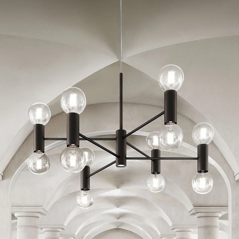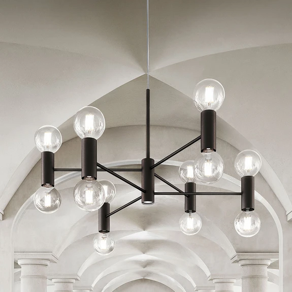 Modern version of the classic chandelier - Chandelier pendant light The Chandelier designer pendant light is an attempt to reinterpret the original form of the Venetian chandelier in a new and modern way, making it accessible for stylish contemporary living spaces. Minimalist forms and clear lines create a harmonious overall look with a total of thirteen light sources, which ensure that even large rooms are brightly lit. Rigid arms run horizontally to all sides from a base in the centre. Narrow, cylindrical brackets are mounted on them, with openings pointing upwards and downwards. The E27 sockets are concealed in the openings. Direct and indirect light is generated by the orientation. A GU10 bulb is placed at the base facing downwards, emitting a spot beam of light directly downwards. Thanks to its uniform colour design, Chandelier can be effortlessly integrated into many interior design concepts. The Italian designer luminaire manufacturers from Modo Luce work with innovative materials to bring versatile, functional and attractive lighting solutions to life. They pursue the Vision of giving every room the right light in the right Form.