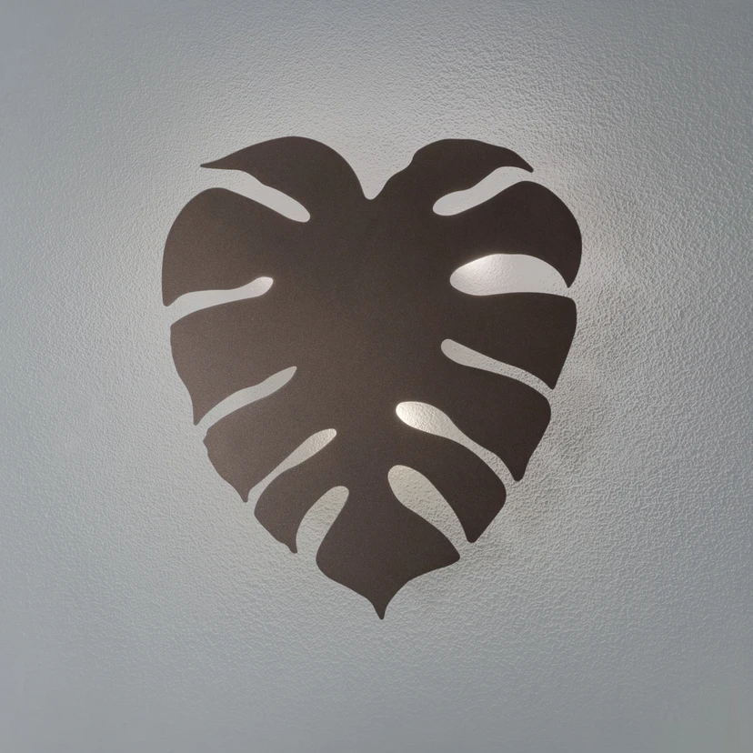 Indirectly shining Monstera wall light, designed as a leaf The Monstera wall light made of steel is designed as a brown silhouette of a leaf of the popular Monstera Deliciosa houseplant. This is particularly emphasised during operation, with three G9 bulbs inserted at the back illuminating the surrounding area of the wall and clearly highlighting the leaf shape.