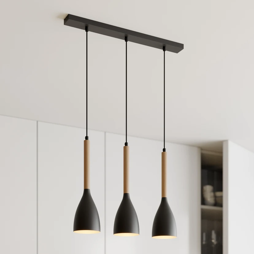 The Muza 3-bulb pendant light in black and light wood combines modern design with natural materials. The combination of metal and wood gives every room an elegant yet warm atmosphere. The light is ideal for living rooms, dining rooms and kitchens and adds stylish accents that enhance the ambience.