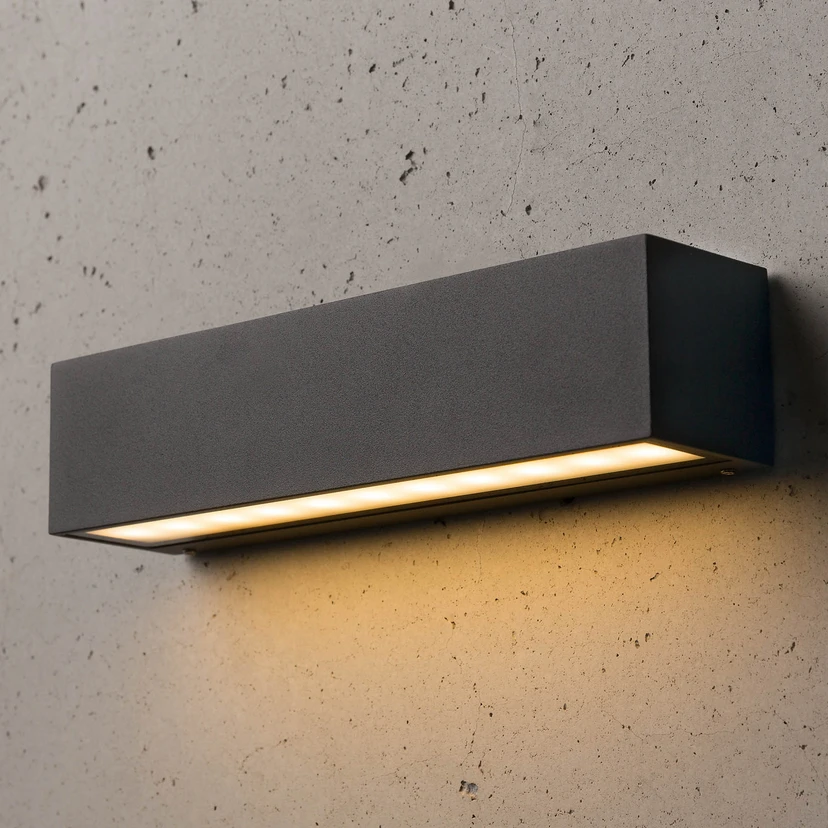 Elongated LED outdoor wall light Medea in graphite Straight-lined and contemporary in design, the LED outdoor wall light Medea visually complements many modern façade styles and property designs. The integrated Philips SMD LEDs emit a soft warm white light directly downwards through the matt protective glass. The beam angle is 110 degrees, creating an inviting ambient illumination that is desirable next to the front door of a residential building, for example, but is also suitable for other outdoor areas.