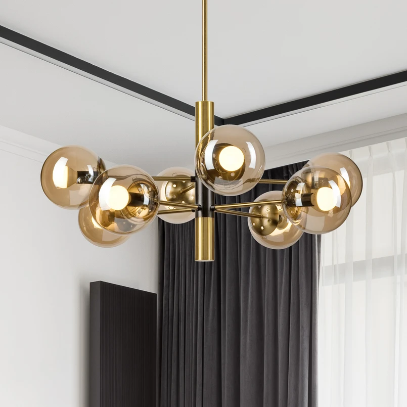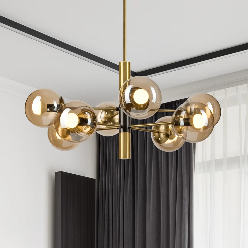 The Natalia ceiling lamp impresses with its modern design and the use of high-quality materials such as glass and steel. The golden and amber colour scheme gives every room a warm and inviting atmosphere. With a diameter of 68 cm and eight E14 sockets, this lamp provides optimal lighting in living and dining rooms as well as in hallways. The light is manufactured in Europe, which underlines its high quality and special design.