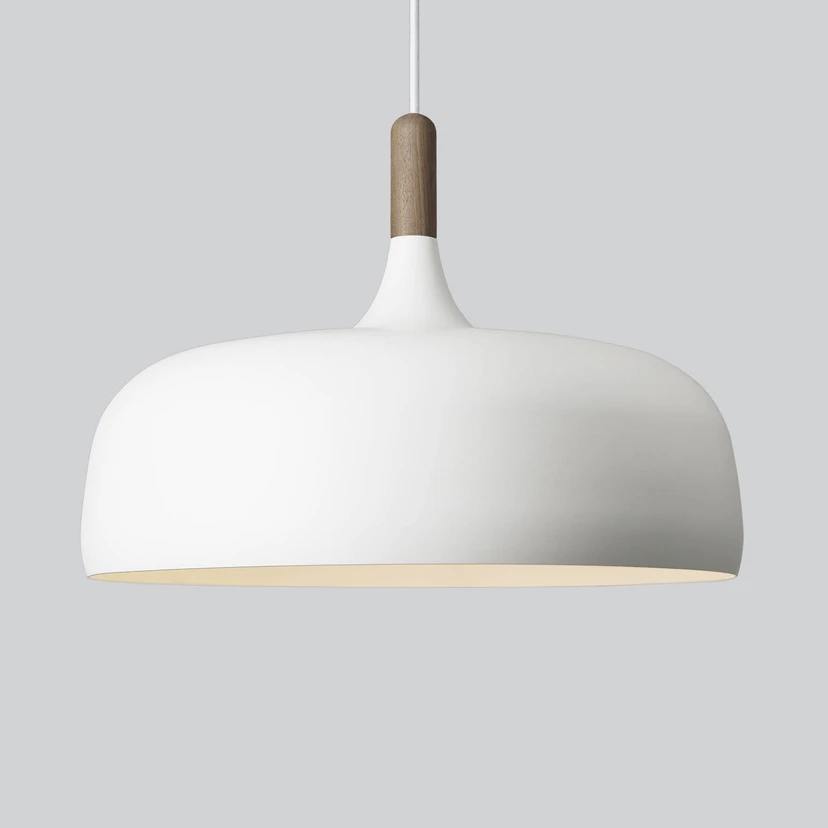 Stylish, modern and a highlight when it comes to lighting quality, that is the Acorn pendant lamp, which Atle Tveit created back in 2012. Since then, the timelessly beautiful Acorn has lost none of its fascination. Due to its width, the decorative shade made of lacquered aluminium provides a large-area illumination, for example of a table. The inside of the shade was painted white for optimal light reflection. Special detail: On the suspension is a decorative wooden element that can be replaced to optimally adapt the look to the rest of the furnishings. A wood decor in light beech and in dark walnut wood is supplied.