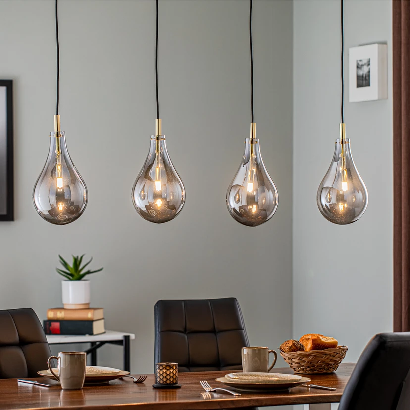 The Oaza pendant lamp, 4-bulb in smoky grey and black, combines modern design with high-quality materials such as glass and steel. This light, manufactured in Europe, impresses with its elegant colour scheme and fits seamlessly into various room concepts, whether in the living room, kitchen or dining room. The combination of smoky grey glass and black steel gives the lamp a timeless aesthetic that is both functional and decorative.