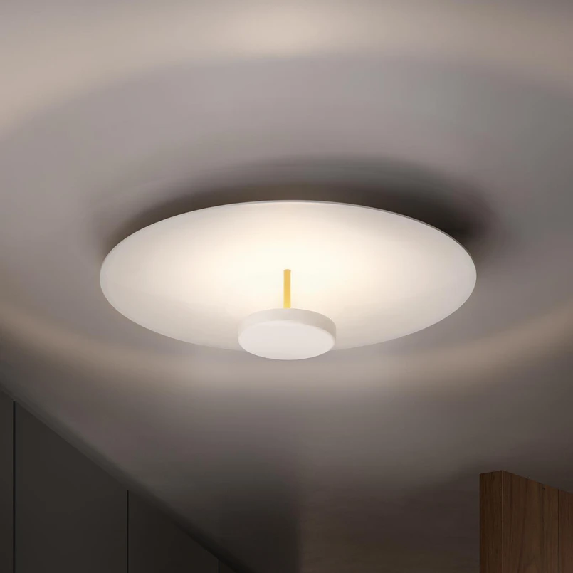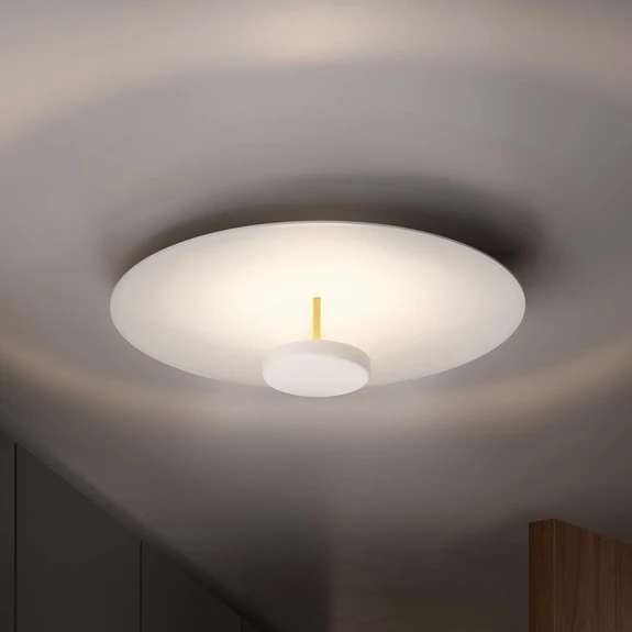 The white Overfly Plus ceiling lamp consists of a large, round aluminium element below the ceiling and an LED unit located at a distance below it. The latter emits warm white light upwards, creating pleasant indirect lighting for private, public and representative interiors. The simple yet distinctive design is completed by a narrow mounting bar between the two main elements. If required, the Overfly Plus LED ceiling light can be dimmed externally.