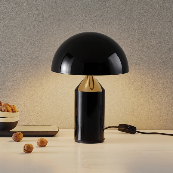 The classic among designer table lamps: Atollo The Atollo table lamp from Oluce has a glamorous and magnificent appearance. It has a cylindrical lamp base that tapers to a point at the top and is fitted with a half-shell-shaped lampshade that forms a single colour with the base. The hemispherical lampshade directs the light downwards onto the table surface, creating an indirect and very pleasant accentuation of the surroundings.