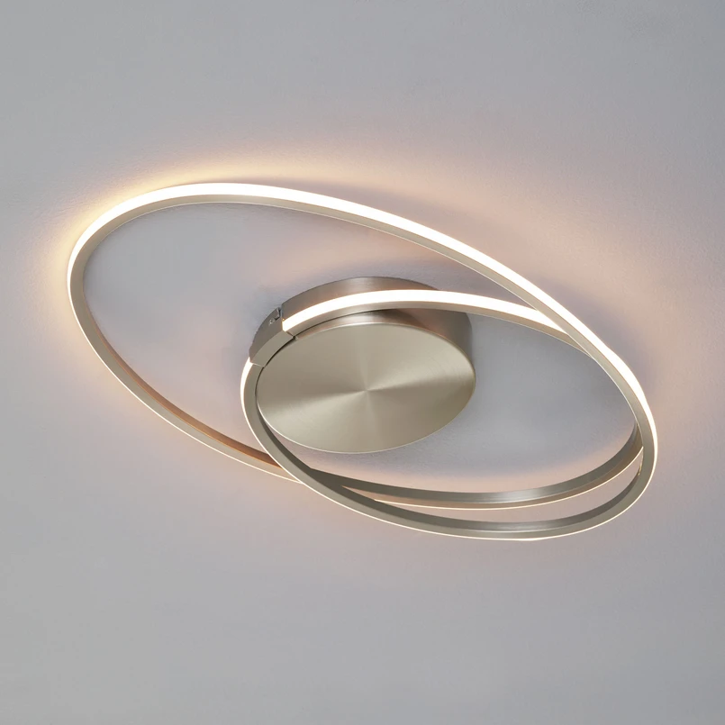 A frame curved into two rings emerges from a circular canopy. On the outside of the rings are continuous strips of plastic, behind which the LEDs are concealed. Their warm white light provides pleasant illumination all around. In combination with its contemporary appearance, Ophelia is the right ceiling luminaire for the modern living area.