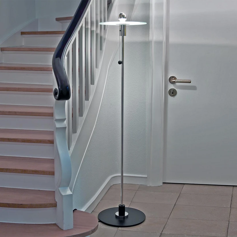 The design of the Bauhaus floor lamp by Prof. Gyula Pap dates back long into the German history: 1923. It is here the Hungarian developed this lamp in the metal workshop in the State Bauhaus in Weimar, the College of Design during the Weimar Republic. Its trademarks are the frosted glass plate, which floats on a nickel-plated metal tube, above a black-painted iron plate. This Bauhaus floor lamp is also equipped with an anti-glare cap.
