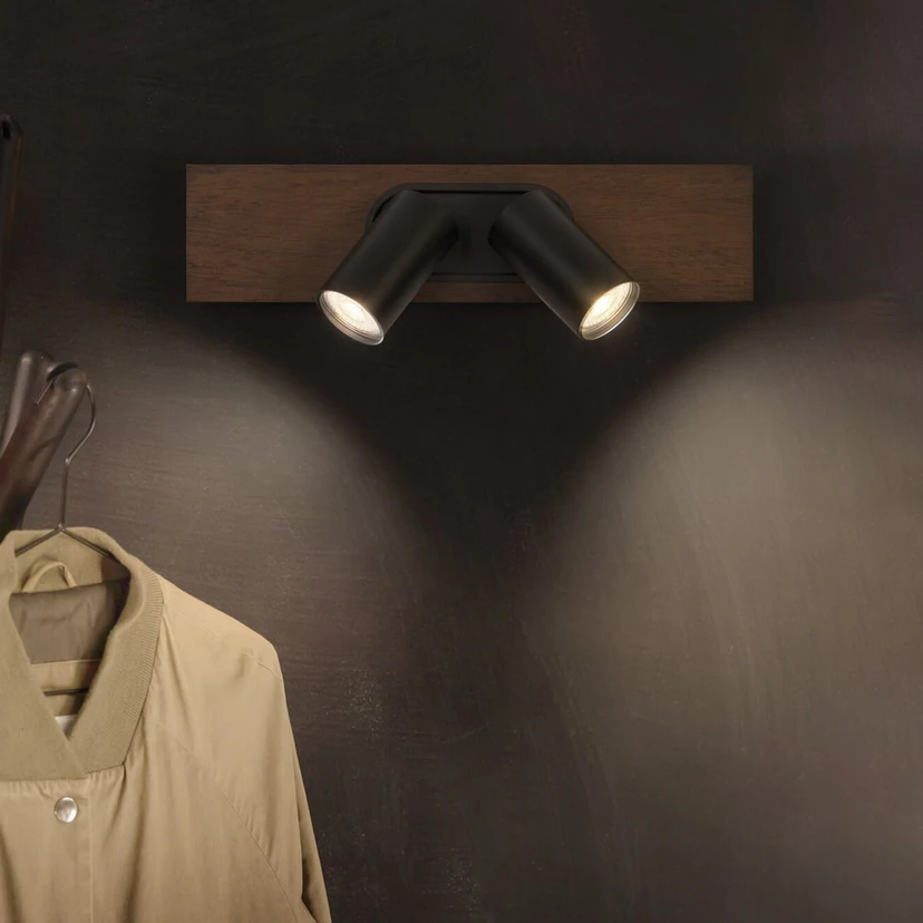 MERCURY is an attractive ceiling light that impresses with flexible, dimmable GU10 LED spotlights and a wooden cover. Product features: The luminaire family includes variants with up to 4 spotlight heads. Housing material: metal and wood. Adjustable spotlight heads. Product advantages: High-quality look and feel. High-quality housing with a matt finish on the metal components. Versatile and adaptable thanks to replaceable LED bulbs. Dimmable OSRAM bulb included. Easy to install. Areas of application: Indoor applications. Corridors, entrance areas, stairwells, living rooms, basements. Kitchens, work areas. Ceiling and wall mounting. Technical features: Complete mounting and connection accessories included.