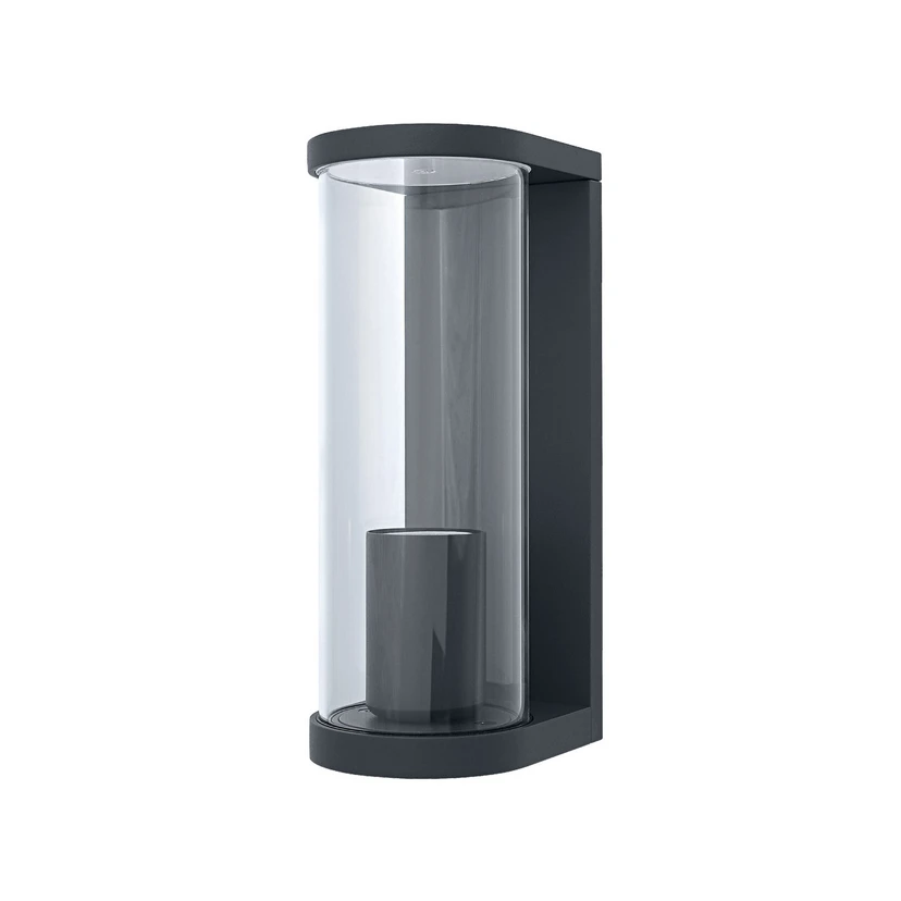 Slim aluminium wall light with E27 socket, clear glass diffuser and sensor option. Product features: Suitable for smart applications thanks to compatibility with SMART+ bulbs. Less light pollution, demand-based lighting (sensor version). Direct lighting. Diffuser material: glass. Diffuser colour: clear. Housing material: aluminium. Housing colour: RAL 7016. IP code: IP44. Product advantages: High flexibility in the choice of bulb thanks to E27 socket. Quick and easy installation. Option with PIR motion detector and daylight sensor, available to match the housing colour. Long-term energy and cost savings (sensor version). Areas of application: Illumination of facades. Entrance lighting. Terraces, balconies. Path lighting. Driveways. Technical features: Complete mounting and connection accessories included. Bulb not included. Safety instructions: All electrical connections must be carried out by qualified personnel only. Caution, risk of electric shock. Product of protection class I. All electrically conductive, metallic housing parts that may become live during operation or maintenance in the event of a fault must be connected to the protective earth conductor throughout.