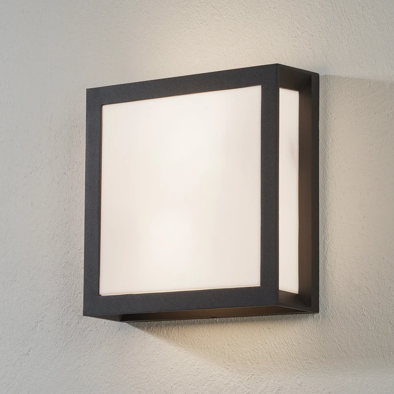Square outdoor wall light Henry, IP44 The Henry outdoor wall light emits light on all sides thanks to its large, opal white diffuser. The anthracite-coloured aluminium frame stylishly frames the lampshade and provides a successful colour contrast. Henry can be used not only as a wall light, but also as a ceiling light to provide timeless general lighting in outdoor areas. The outdoor light is fitted with two E27 bulbs.