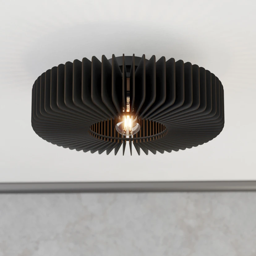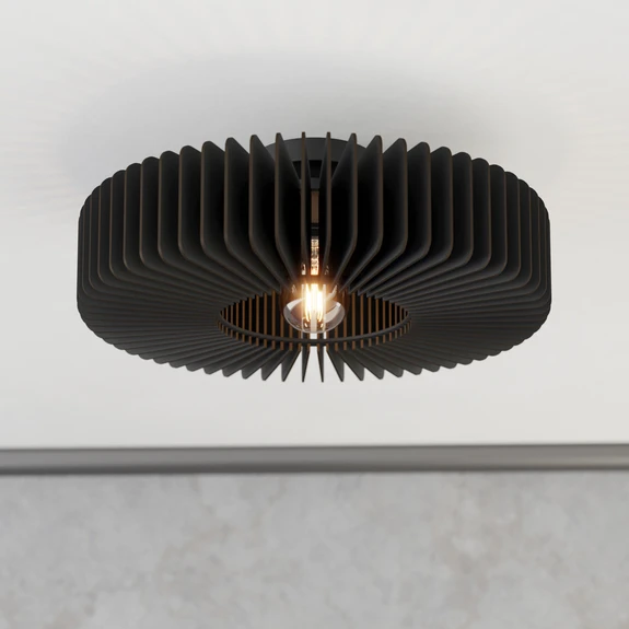 The Palombaia ceiling light consists of a steel frame with thin wooden elements with a lacquered surface arranged around it. These allow the emitted light to appear as an effective halo on the ceiling.