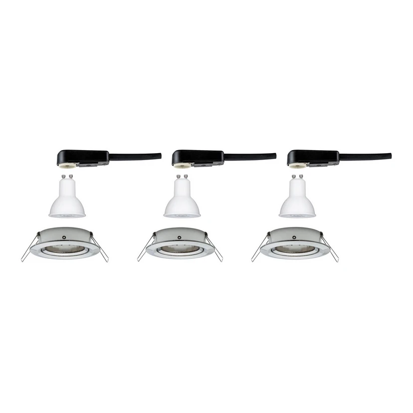 Swivelling and dimmable in 3 levels - Nova LED spot in a set of 3 These lights allow you to create a customised lighting concept by simply installing them in the ceiling with retaining springs and linking the individual lights together, whereby the distance between the lights can be freely selected. The spots are made of aluminium and fitted with replaceable LED bulbs with GU10 bases. This emits warm white light into the room, can be swivelled through 50° and is dimmable in three stages using a standard light switch.