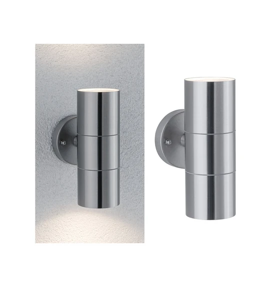 The Flame outdoor wall light in brushed stainless steel has a thoroughly modern look, with its cylindrical body discreetly divided into three sections. It has a GU10 socket on the top and bottom, creating an attractive up-and-down accent on the façade. Depending on the bulb selected, the beam angle, light colour and brightness can be adjusted to suit individual requirements.