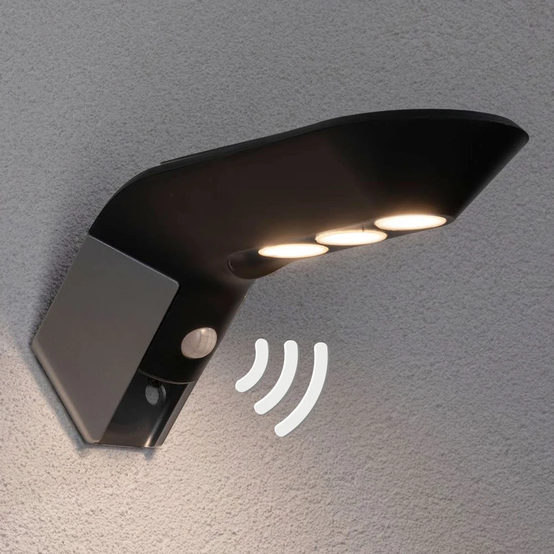 Futuristic, self-sufficient LED outdoor wall light Soley Pulmann has given its sensor-controlled LED outdoor wall light Soley an unusual design with its protruding funnel shape that tapers downwards. Operable completely independently of a power supply, Soley can be used as an orientation aid in the entrance area or as a lighting accent on the façade. Sunlight serves as the energy source, which is collected during the day by the solar module integrated into the top, converted into electricity and fed into the rechargeable battery, which is charged after 8 hours. This powers the three downward-facing LED light points for up to 10 hours. They are activated by a twilight sensor or a switch on the back. Thanks to the motion detector, SOLEY switches from a low-level orientation light that shines continuously at night to full light output as soon as people come closer than 3 metres to the outdoor wall light.