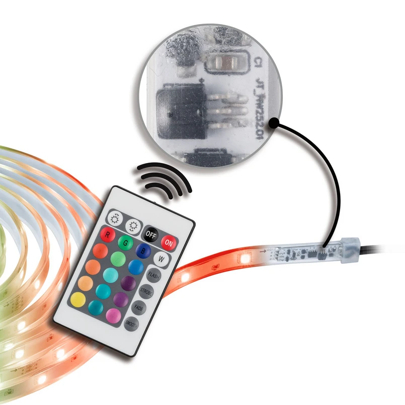 Transparent SimpLED Outdoor LED strip in a complete set This SimpLED Outdoor complete set, consisting of a transparent LED strip, fixing material, plug-in power supply unit and remote control, can be used to create a variety of outdoor lighting decorations. The plug-in complete set is ready for connection to the socket and can be quickly mounted on straight or curved surfaces thanks to the fixing material supplied. The light colour can be individually adjusted using the included remote control. Thanks to the memory function, the selected light colour is saved and the strip lights up in this light colour when it is switched on again - Plug & Play complete set incl. transformer, mains plug and fixing material - Not expandable - Cannot be combined with YourLED and MaxLED strips